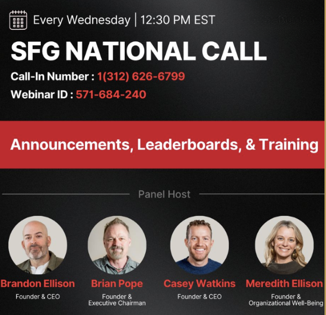 Tune into the SFG National Call for live leadership announcements, leaderboard recognition, and high-impact training that keeps top agencies aligned and performing at the highest level.