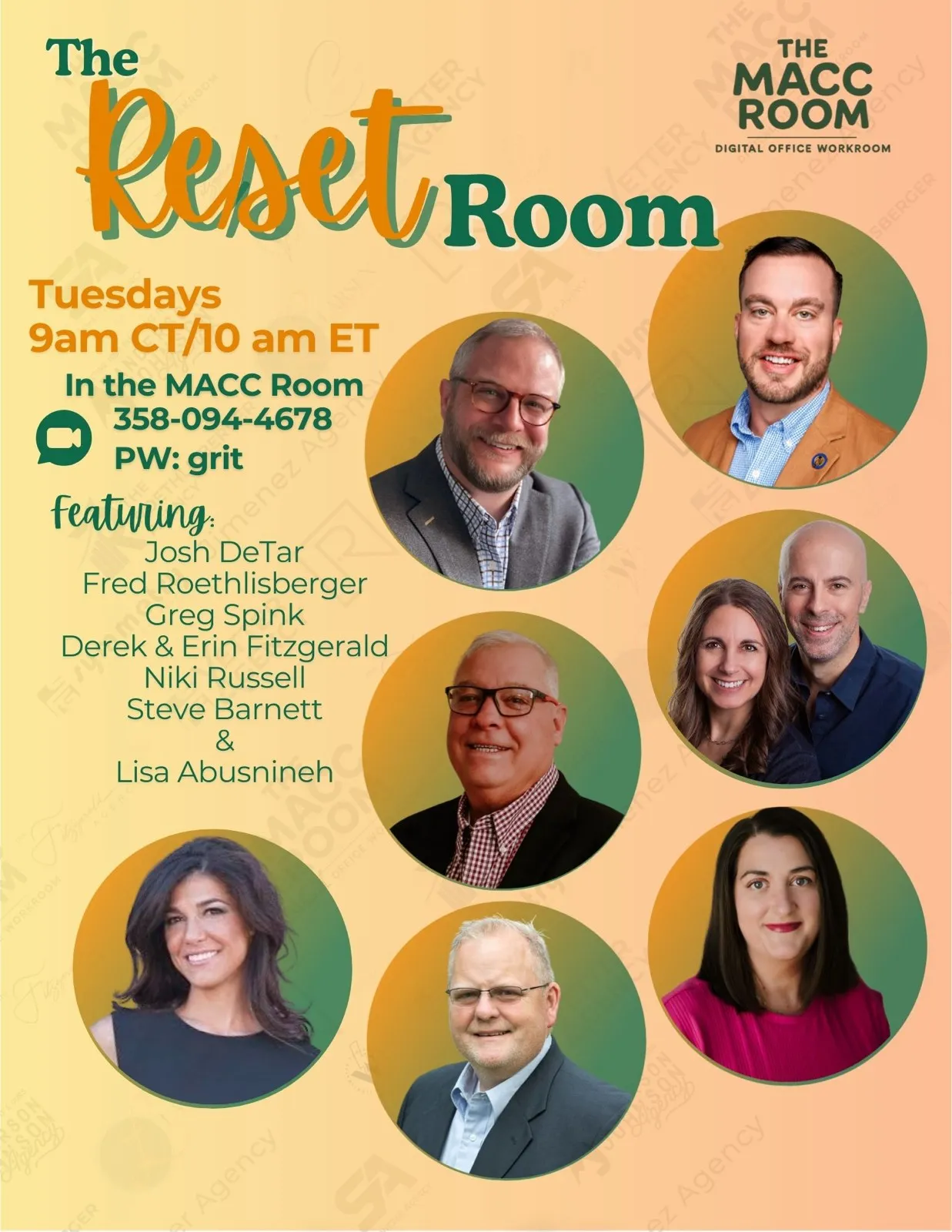Tuesdays at 10am EST is the Reset Room CALL featuring Fred Roethlisberger, Lisa Abusnineh, and Josh DeTar talking the best advanced market strategies and handling real life scenarios